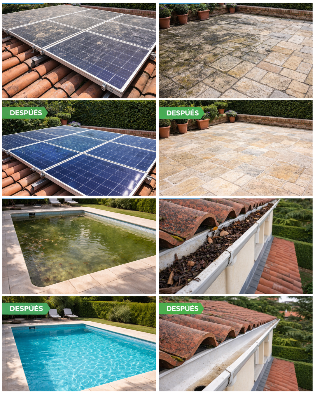 Descubre algunos de nuestros trabajos recientes y observa la diferencia que puede lograr una limpieza profesional en piscinas, terrazas, placas solares y canalones.